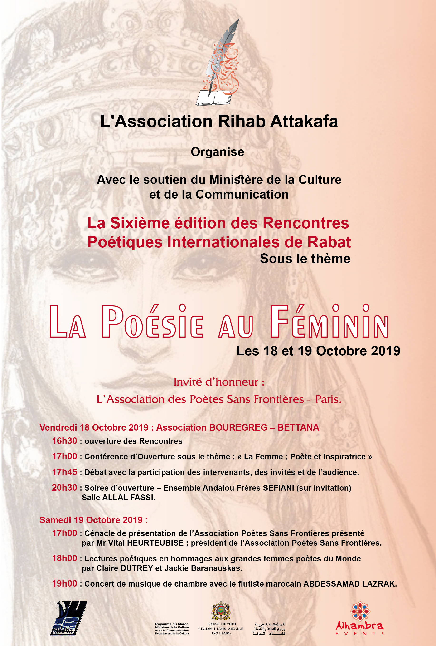 Après le franc succès rencontré lors des éditions précédentes, l’Association RIHAB ATTAKAFA organise, avec le soutien du Ministère de la Culture, et en partenariat avec l’Alhambra Events la sixième édition des Rencontres Poétiques Internationales de Rabat sous le thème : « La Poésie Au Féminin » Avec la participation d’imminents poètes marocains et européens qui se sont regroupés autour de la poésie pour créer un véritable pont d’échange poétique et culturel d’une part et d’autre de la méditerranée. Le programme des rencontres se présentera comme suit :