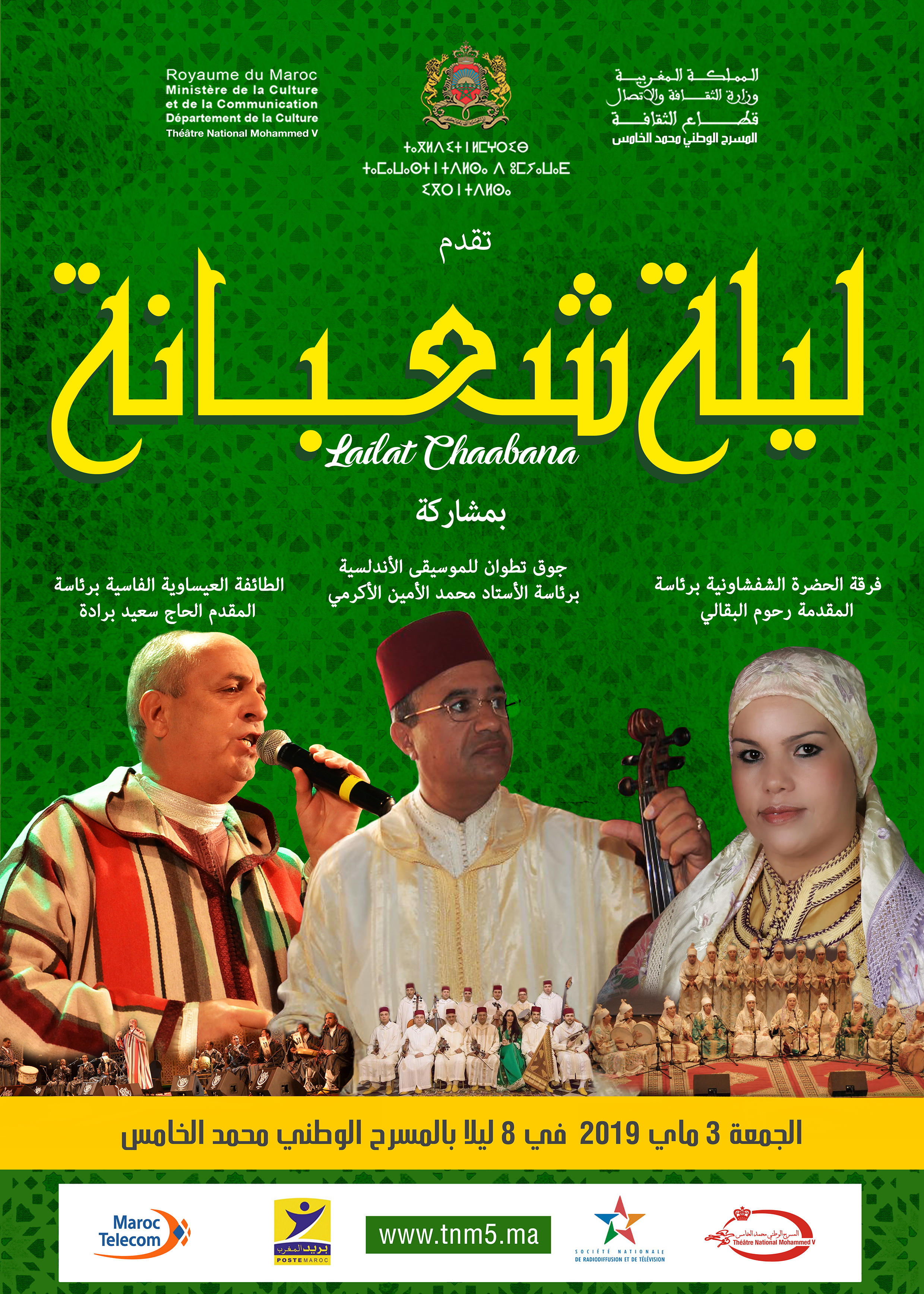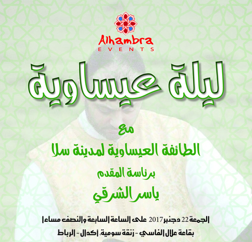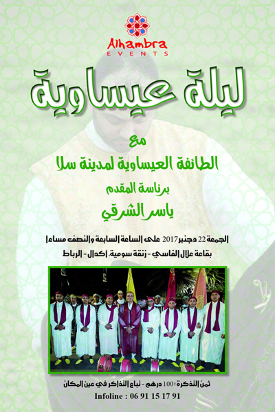 La traditionnelle soirée mystique de CHAABANA est un rituel pratiqué par les familles marocaines depuis la nuit des temps et qui est célébrée chaque année le 14 du mois de CHAABANE par des cérémonies dédiées au DIKR et au SAMAA ainsi qu’aux chants soufis afin de fêter l’arrivée du Ramadan et de commencer les grands préparatifs pour ce mois sacré de piété et de recueillement. Le grand succès réalisé par les soirées mystiques organisées au Théâtre National Mohammed V, en partenariat avec l’Alhambra Events, confirme le souci de permanente d’œuvrer activement à la préservation du patrimoine Marocain et des traditions ancestrales qui caractérisent le royaume depuis des siècles. Le Public de Rabat aura donc rendez-vous avec une très belle soirée « CHAÄBANA » et un plateau artistique de choix animé par