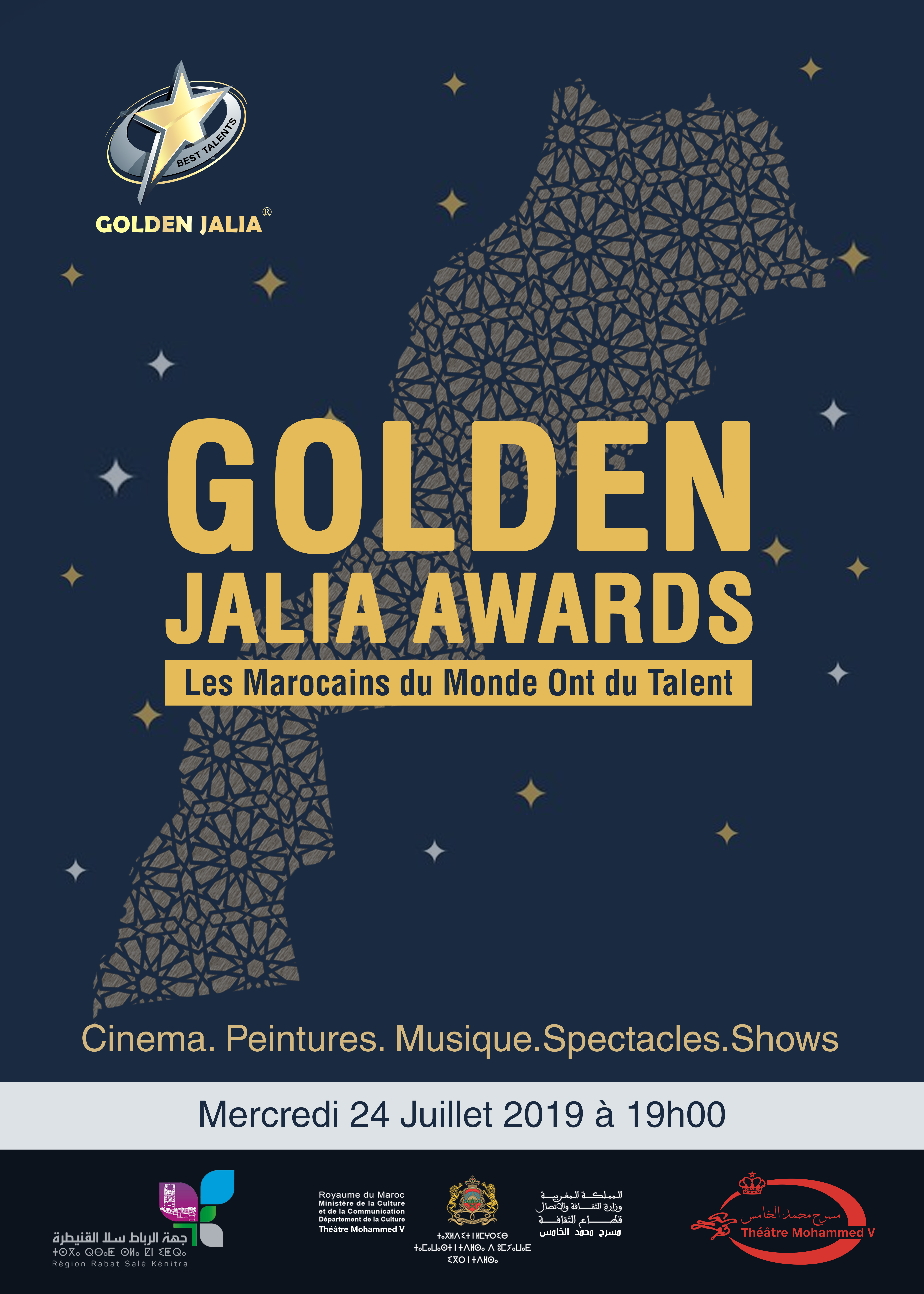 La région de Rabat organise, et en partenariat avec le Théâtre National Mohammed V, la première édition des GOLDEN JALYA AWARDS afin de primer et récompenser les marocains du monde qui se sont démarqué dans plusieurs domaines d’activité tels que l’immobilier, l’entreprenariat, le commerce, la diplomatie, la musique, le journalisme, la culture, la production audiovisuelle, … Une cérémonie haute en couleurs avec la participation, notamment, d’artistes nationaux et internationaux.