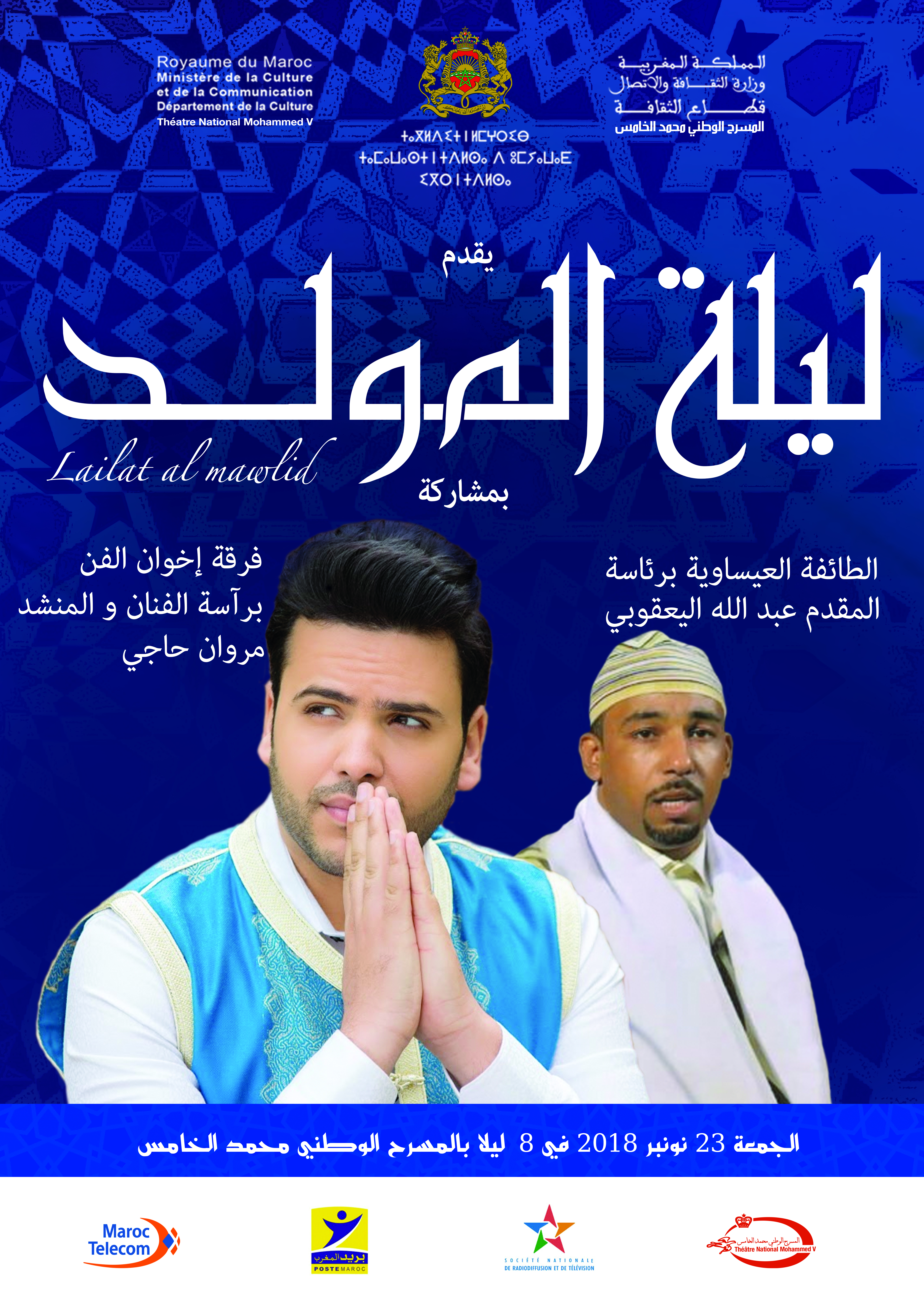 La traditionnelle soirée mystique de LAYLAT AL MAWLID est un rituel pratiqué par les familles marocaines depuis la nuit des temps et qui est célébrée chaque année par des cérémonies dédiées au DIKR et au SAMAA ainsi qu’aux chants soufis. Le grand succès réalisé par les soirées mystiques organisées au Théâtre National Mohammed V confirme le souci de l’établissement d’œuvrer activement à la préservation du patrimoine Marocain et des traditions ancestrales qui caractérisent le royaume depuis des siècles. Le Public de Rabat aura donc rendez-vous avec une très belle soirée « MAWLID ANNABAOUI » et un plateau artistique de choix animé par
