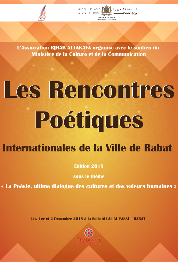 L’Alhambra Events et l’Association RIHAB ATTAKAFA, organisent avec l soutien du Ministère de la Culture, l’édition 2018 des Rencontres Poétiques Internationales de Rabat les 1er et 2 Décembre 2018 sous le thème